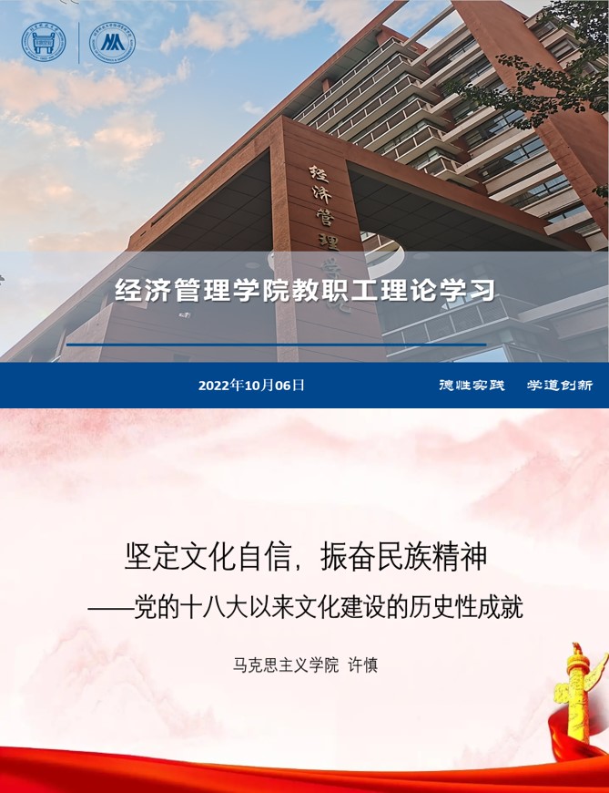为深入学习贯彻习近平新时代中国特色社会主义思想、党的十九大和十九届历次全会精神,弘扬伟大建党精神,充分宣传展示党和国家事业取得的历史性成就、发生的历史性变革,进一步振奋精神、凝聚力量,在党的二十大召开之际,根据学校党委开展“新时代新成就”宣讲活动的工作安排,2022年10月6日下午,8455新葡萄场网站组织全院教职工理论学习,开展《坚定文化自信,振奋民族精神——党的十八大以来文化建设的历史性成就》专题宣讲活动。本次学习活动邀请了学校马克思主义学院许慎副教授做主题宣讲,以线上和线下形式结合进行,学院全体院领导、党委委员和教职工党支部书记在经管楼809参加学习,学院全体教职工在线上参加学习,会议由学院党委书记武森主持。